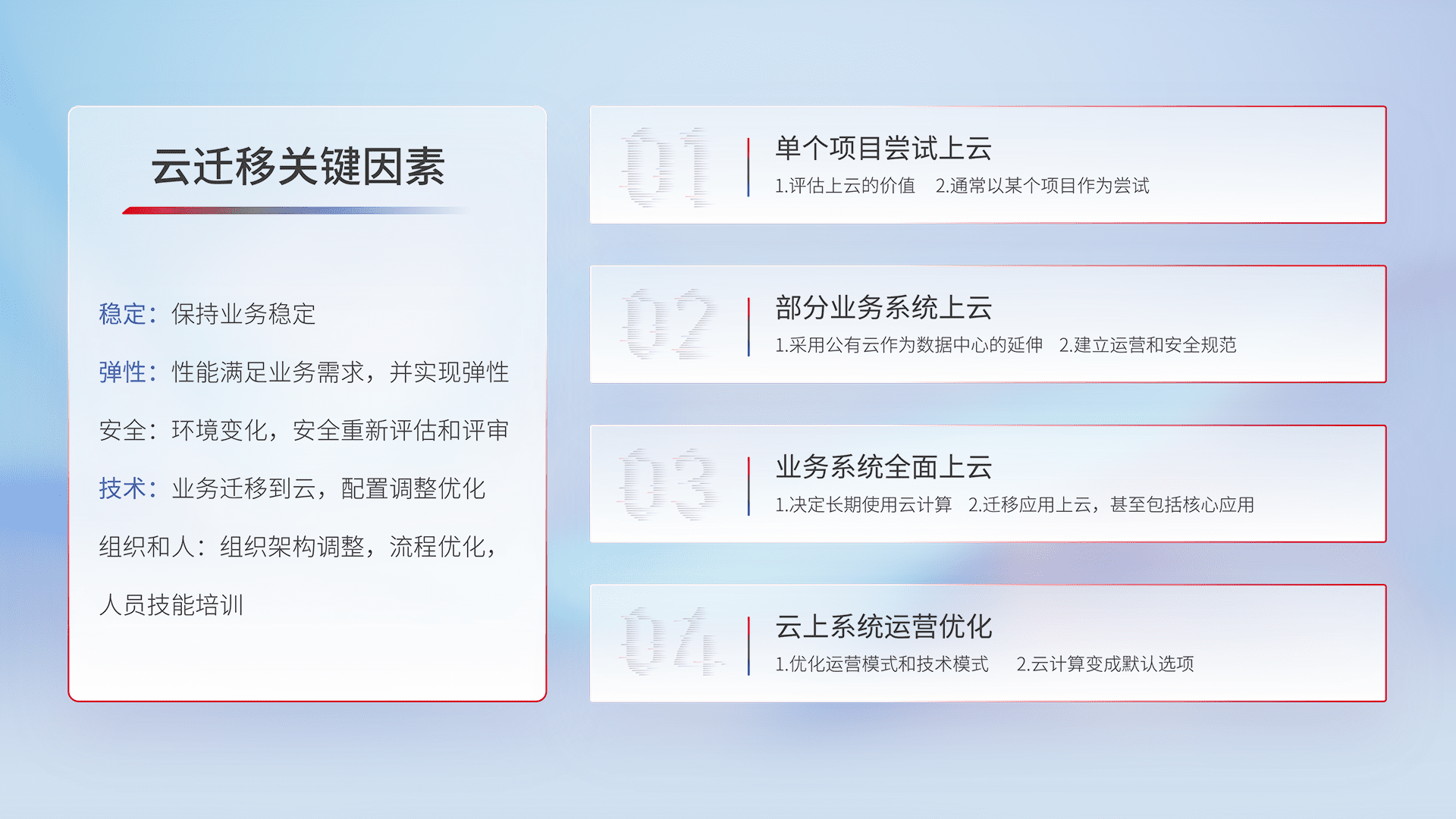 结合实际业务,,从规划设计、、云平台选型、、云原生改造、、、、数据迁移、、、、集成交付,,迁移全过程为客户识别最佳上云路径,,做好风险识别管理,,,,设计网络架构、、、身份权限、、安全审计合规、、操作审计、、、、日志审计、、、、监控告警策略、、、、多站点容灾设计等,,,,对云上基础设施进行整体规划,,,提升IT治理水平,,,以满足弹性、、、、高可用、、、、高性能的需求。。。