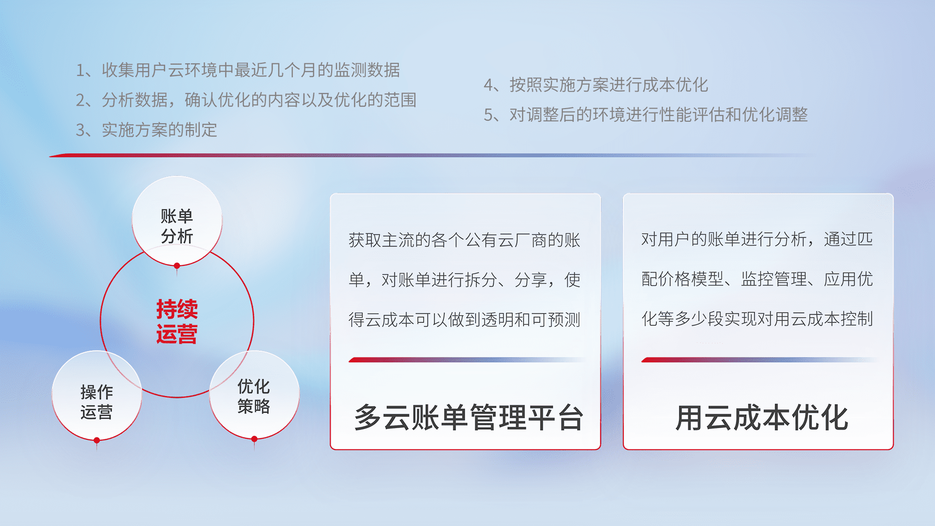 通过多云纳管,,以统一的资源数据模型把客户的云资源进行抽象和封装,,,进而实现对多云资源的统一操作,,,,保障云资源管理的可靠性、、、、稳定性与可用性。。量身定制化运维内容,,配置、、开发运维、、、、补丁管理、、、备份、、监控、、认证和访问管理、、、审计和日常巡检等,,,保障在用云过程中的可靠度,,,稳定度以及高可用率。。。