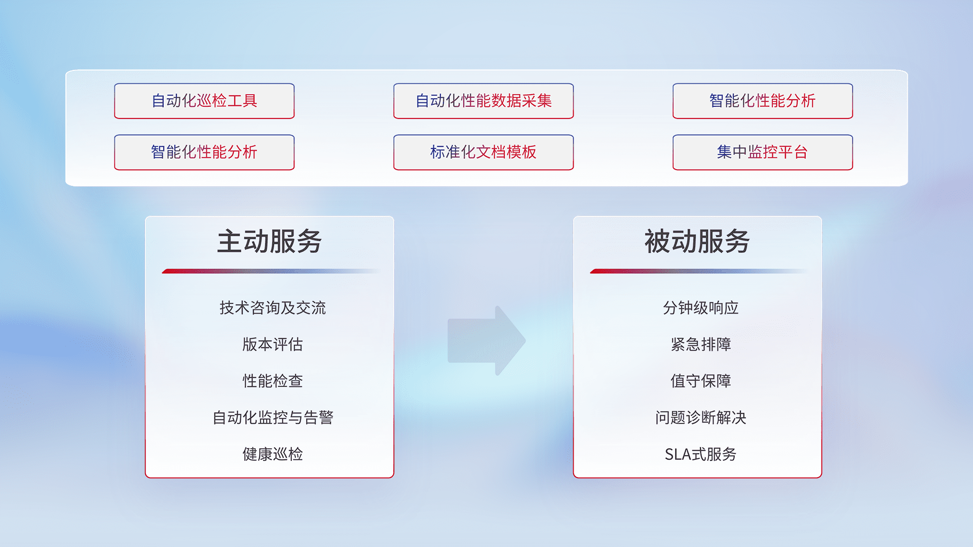智能化工具和标准化文档,,保障服务质量,,,,提供主动服务(包含技术咨询、、版本评估、、、、性能检查、、自动化监控与告警、、、、健康巡检)和被动服务包含(分钟级响应、、、紧急排障、、、值守保障、、、问题诊断解决、、、、SLA服务)。。。。